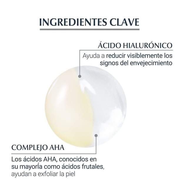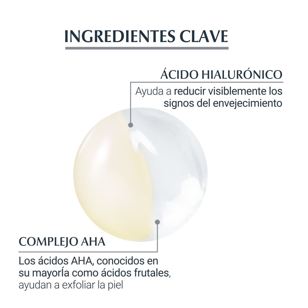 Eucerin Hyaluron-Filler Noche es una crema hidratante nutritiva de noche que rellena visiblemente las arrugas y las líneas de expresión. También contiene dexpantenol, que acelera el proceso de regeneración celular durante la noche. Eucerin Hyaluron-Filler Noche Peeling & Serum está formulado para utilizarse junto con Eucerin Hyaluron-Filler Noche. Está pensado y creado para ofrecer un doble efecto que alisa la piel y le da un aspecto radiante. La fórmula en gel contiene ácido hialurónico3 de alto y bajo peso molecular, mientras que la emulsión contiene glicina saponina y un eficaz complejo AHA (alfahidroxiácidos) exfoliante. Muchos AHA se conocen como ácidos frutales.